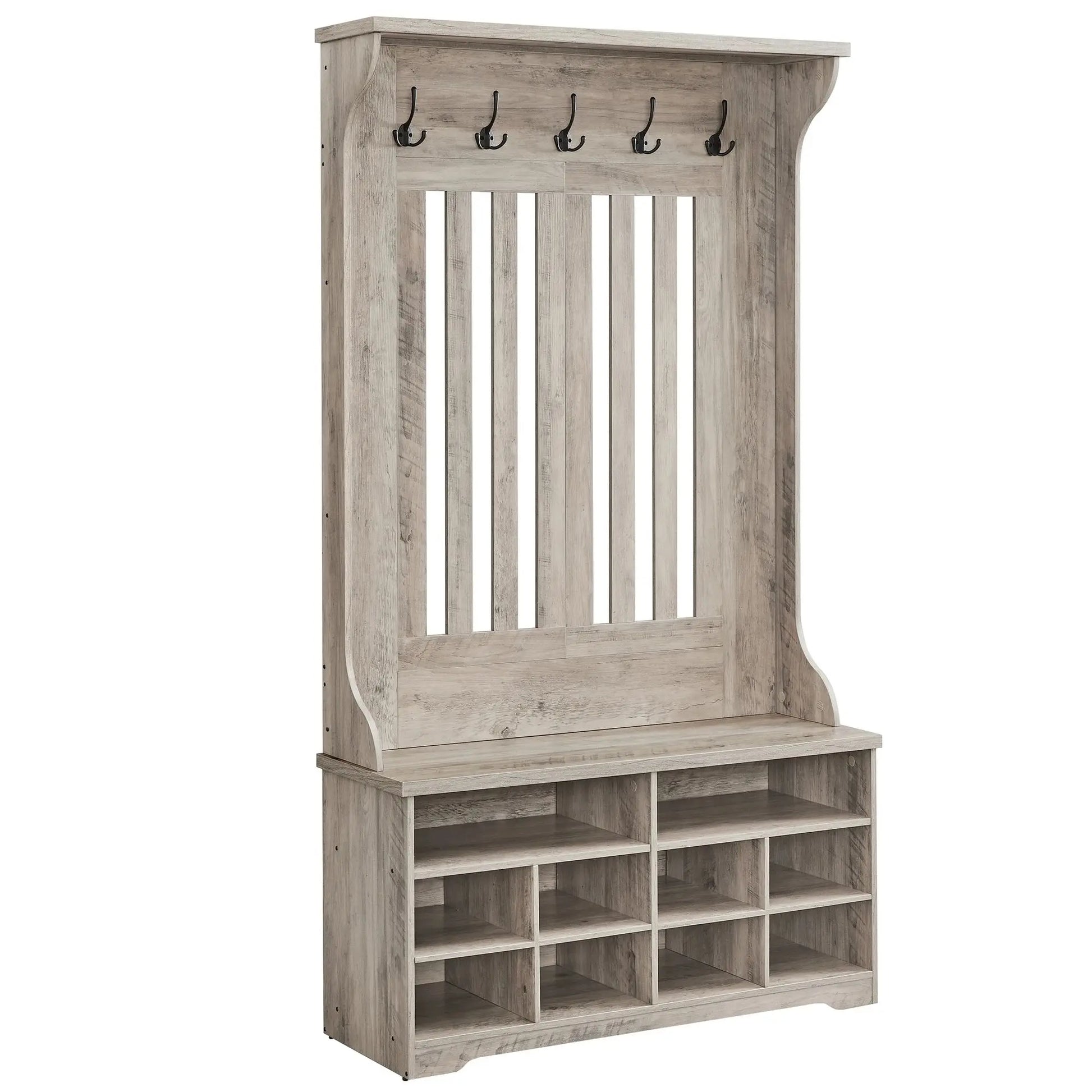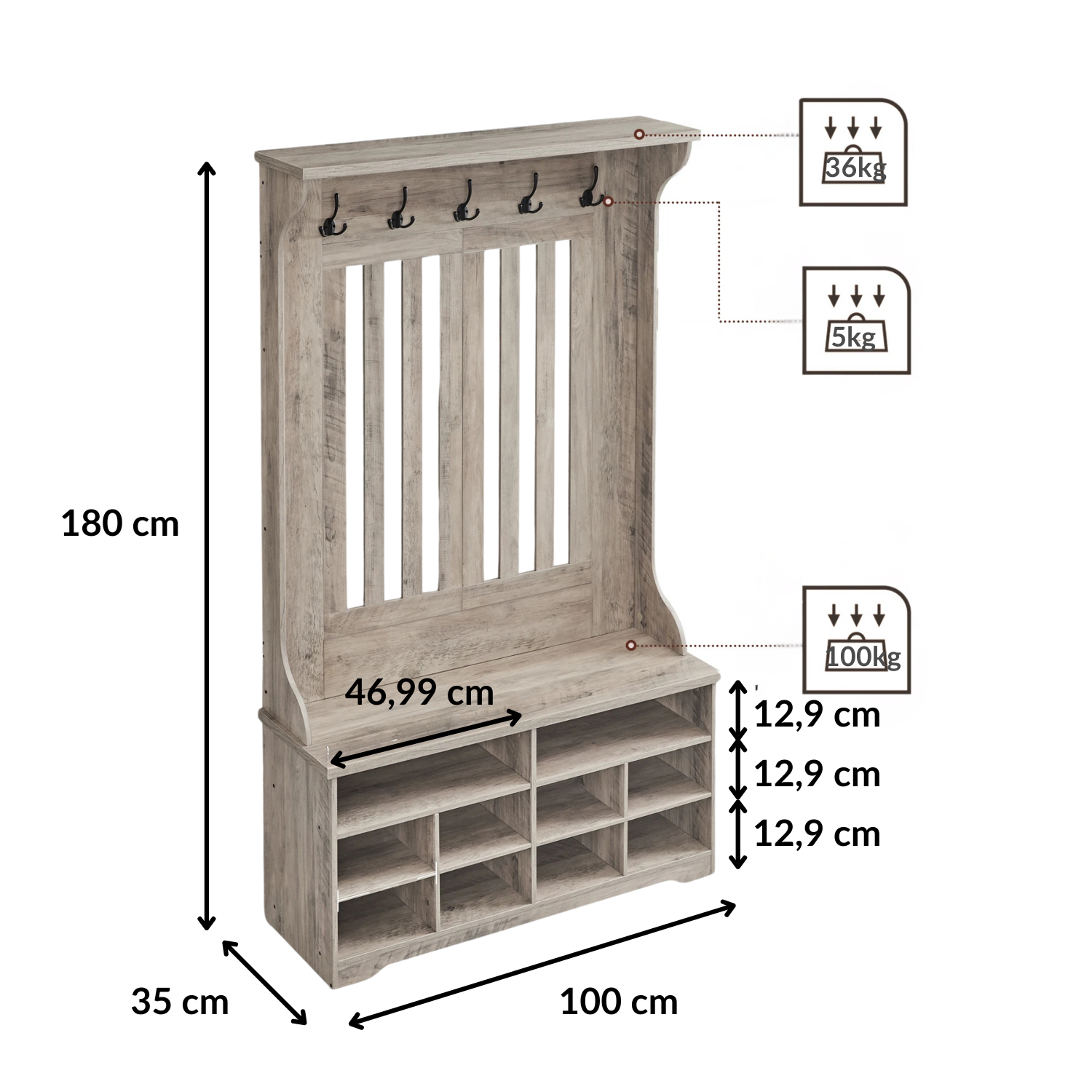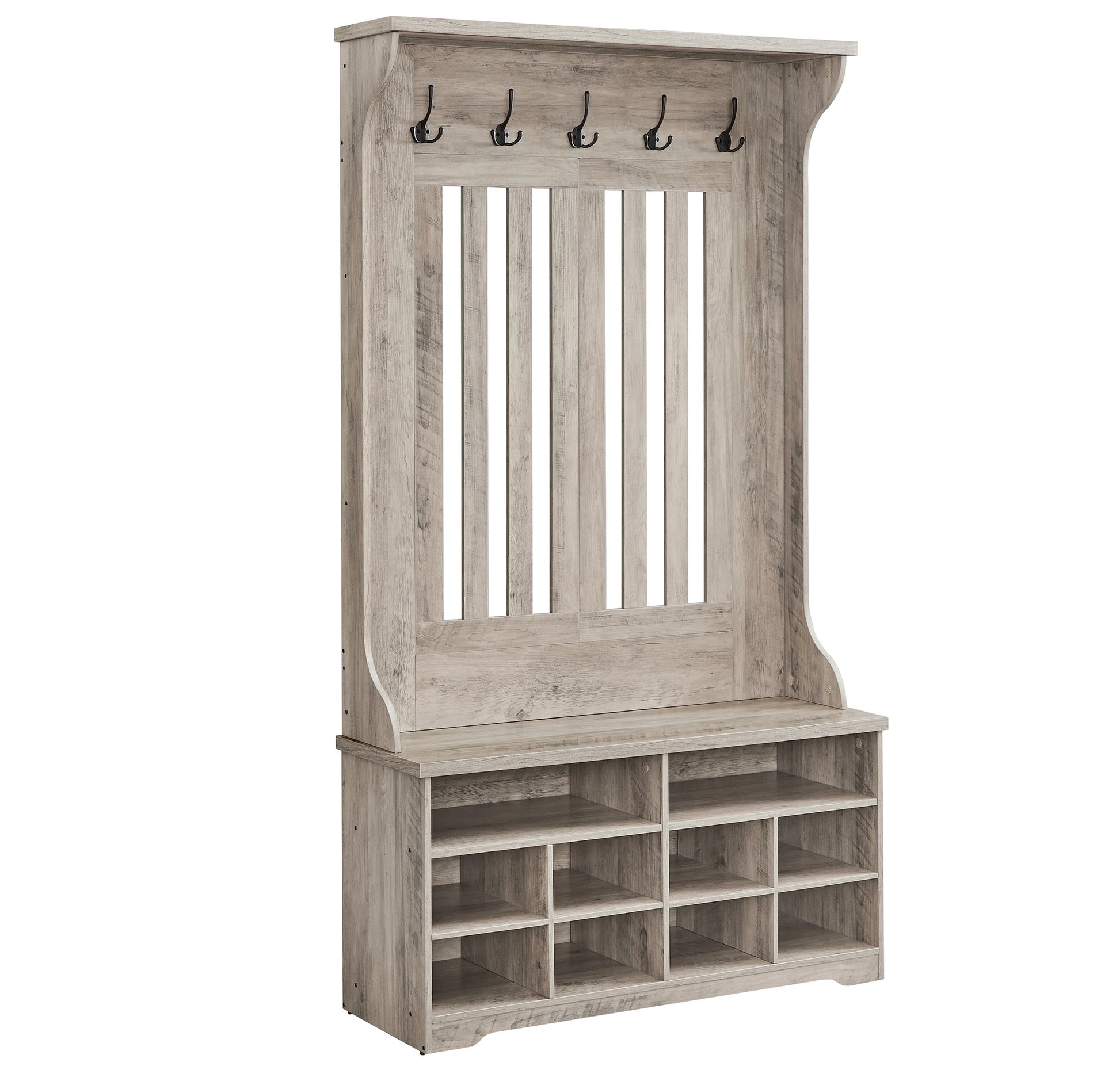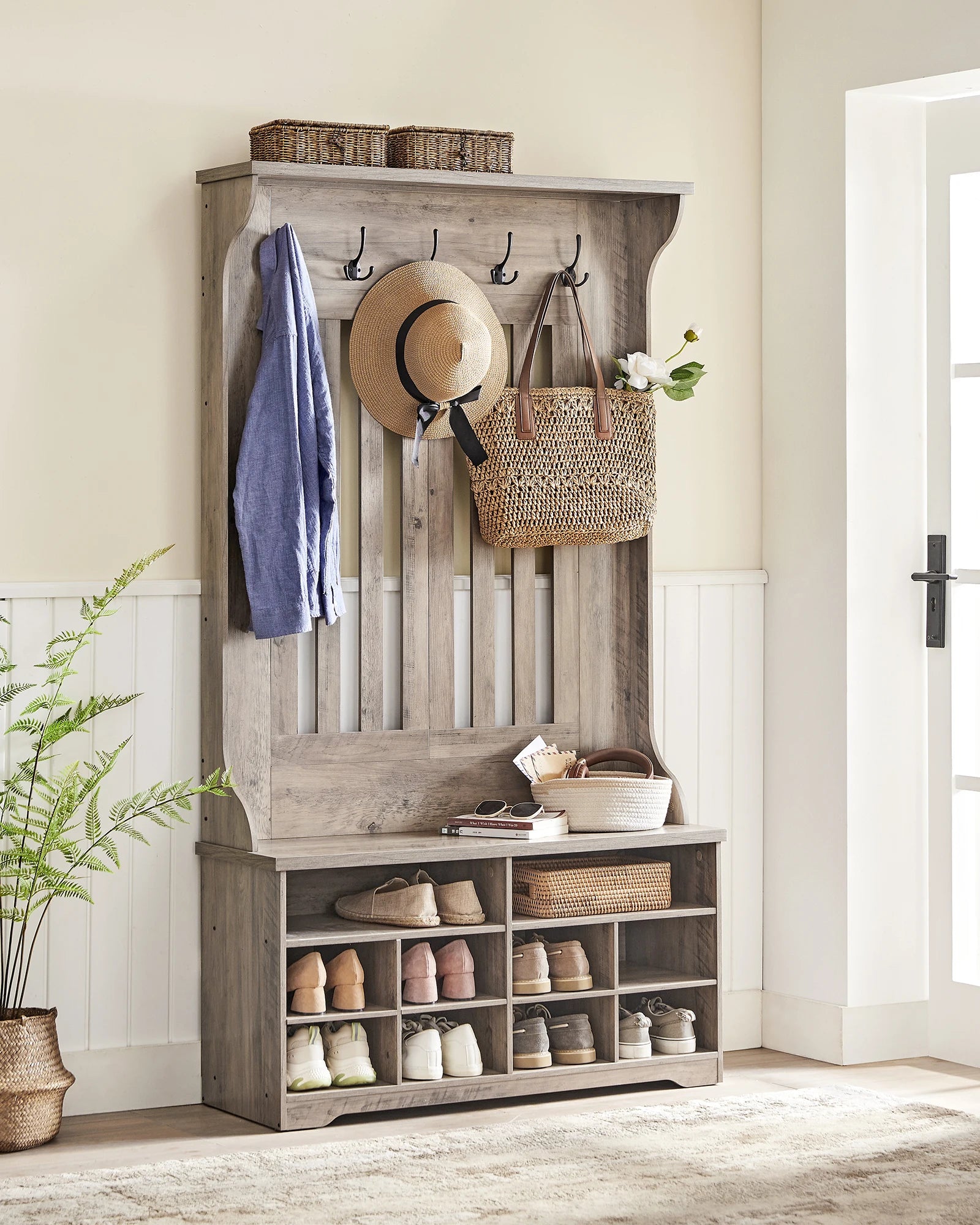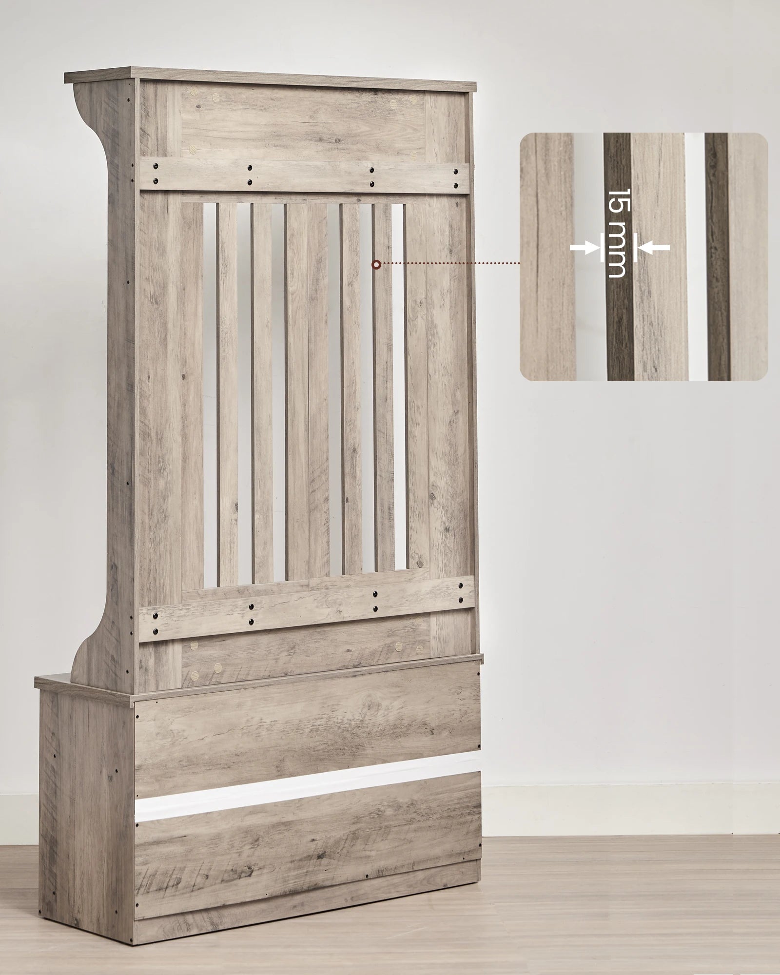 Ce meuble d’entrée tout‑en‑un couvre plusieurs besoins : un banc confortable pour s’asseoir, un grand coffre/étagère pour ranger chaussures, gants et accessoires, et un panneau solide avec 5 crochets pour manteaux, sacs ou chapeaux. Son design vertical et sobre s’adapte parfaitement aux couloirs étroits, à une entrée ou même à un coin bureau.