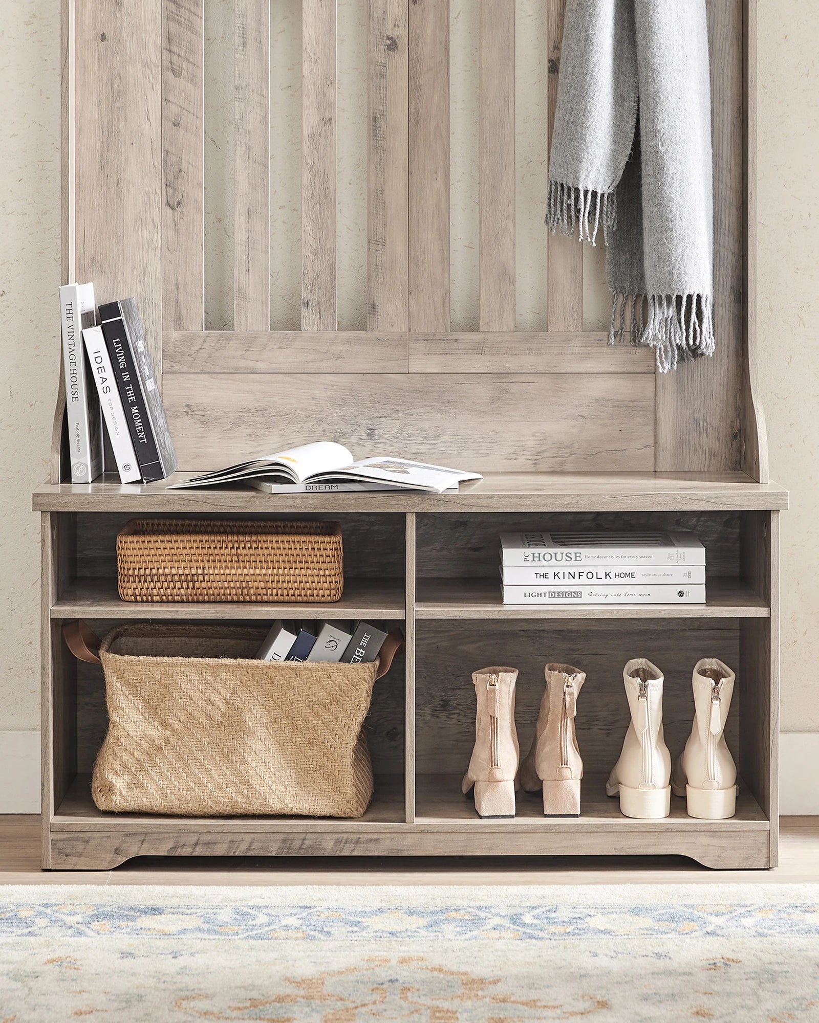 Un banc équipé d’un grand coffre ou d’une étagère abrite chaussures, gants ou autres accessoires.